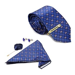 MUTAQINOTI Mens Blue Silk Blend Necktie Set Incl Pocket Square Cufflinks Golden Tiepin Brooch American Style Formal Tie Gift Set for Men (BU037GP)